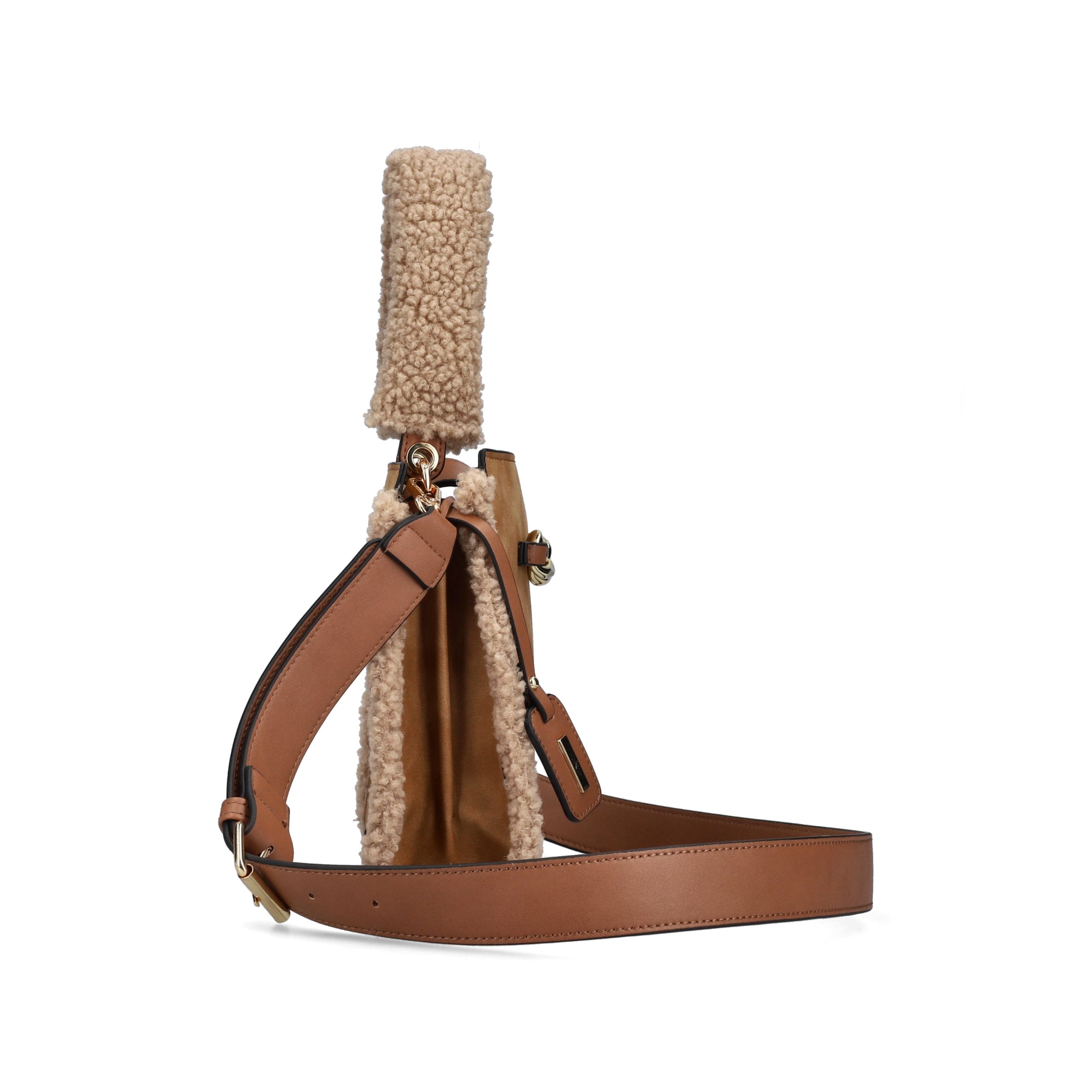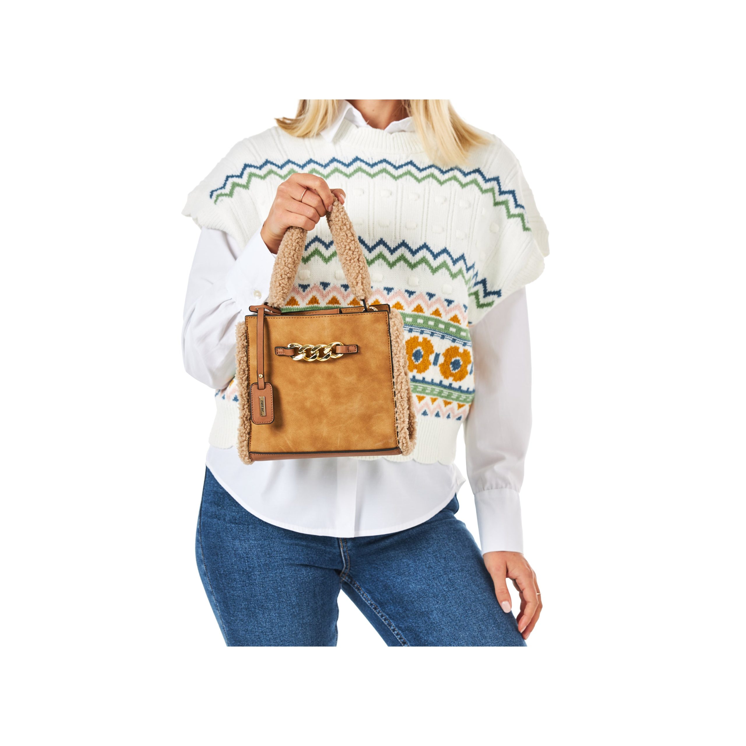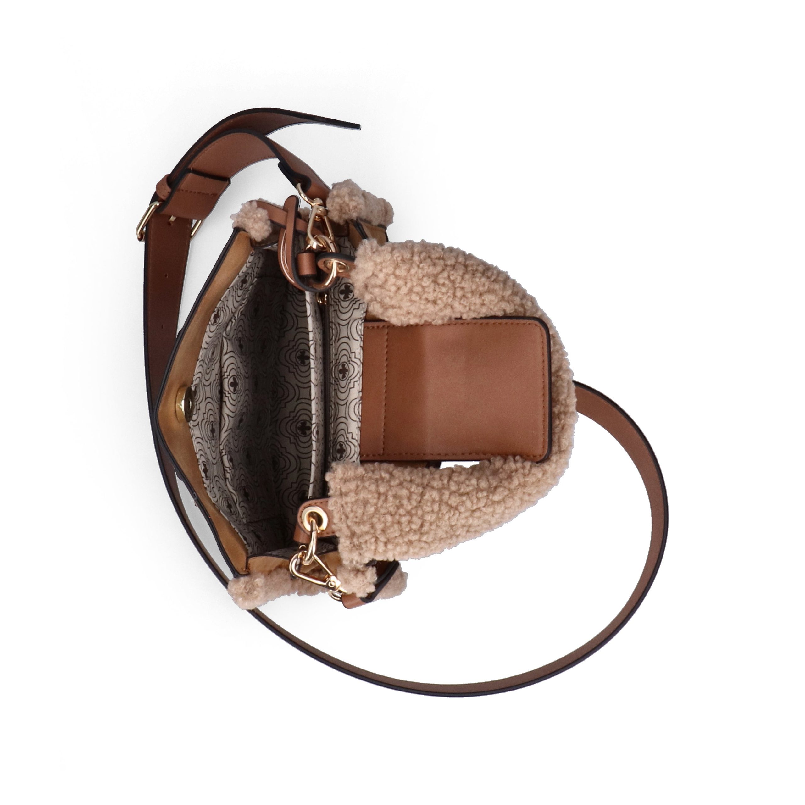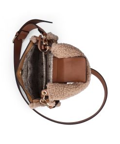 Small, but not to be underestimated! This brown-beige bag is a fashionable eye-catcher with its teddy highlights and golden details. Its main pocket is divided into two equal parts, one with an inner zip pocket and the other with two small pockets without closure. The main pockets are practically closed by a strap with