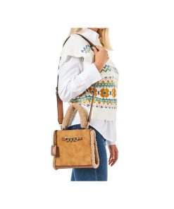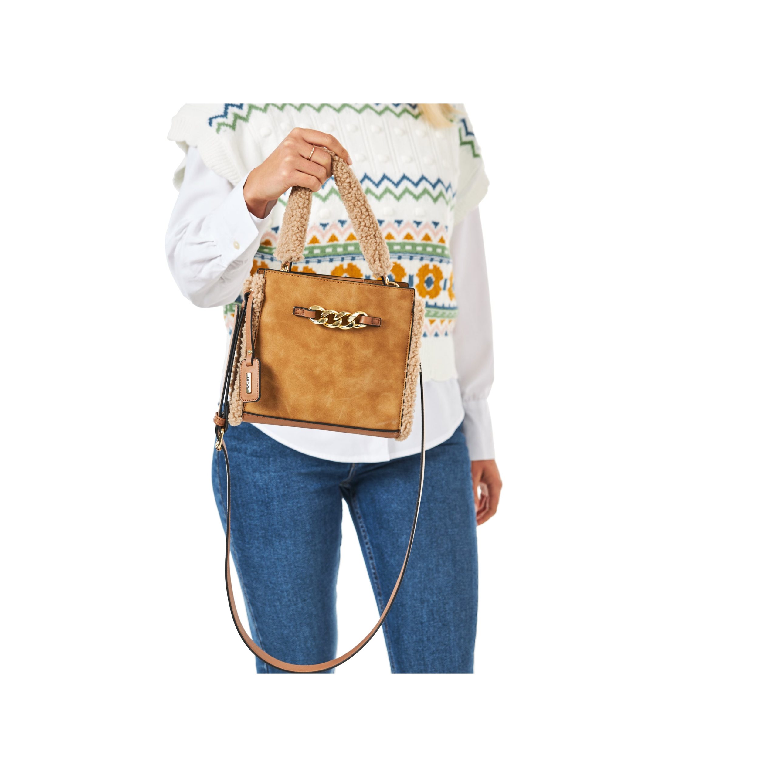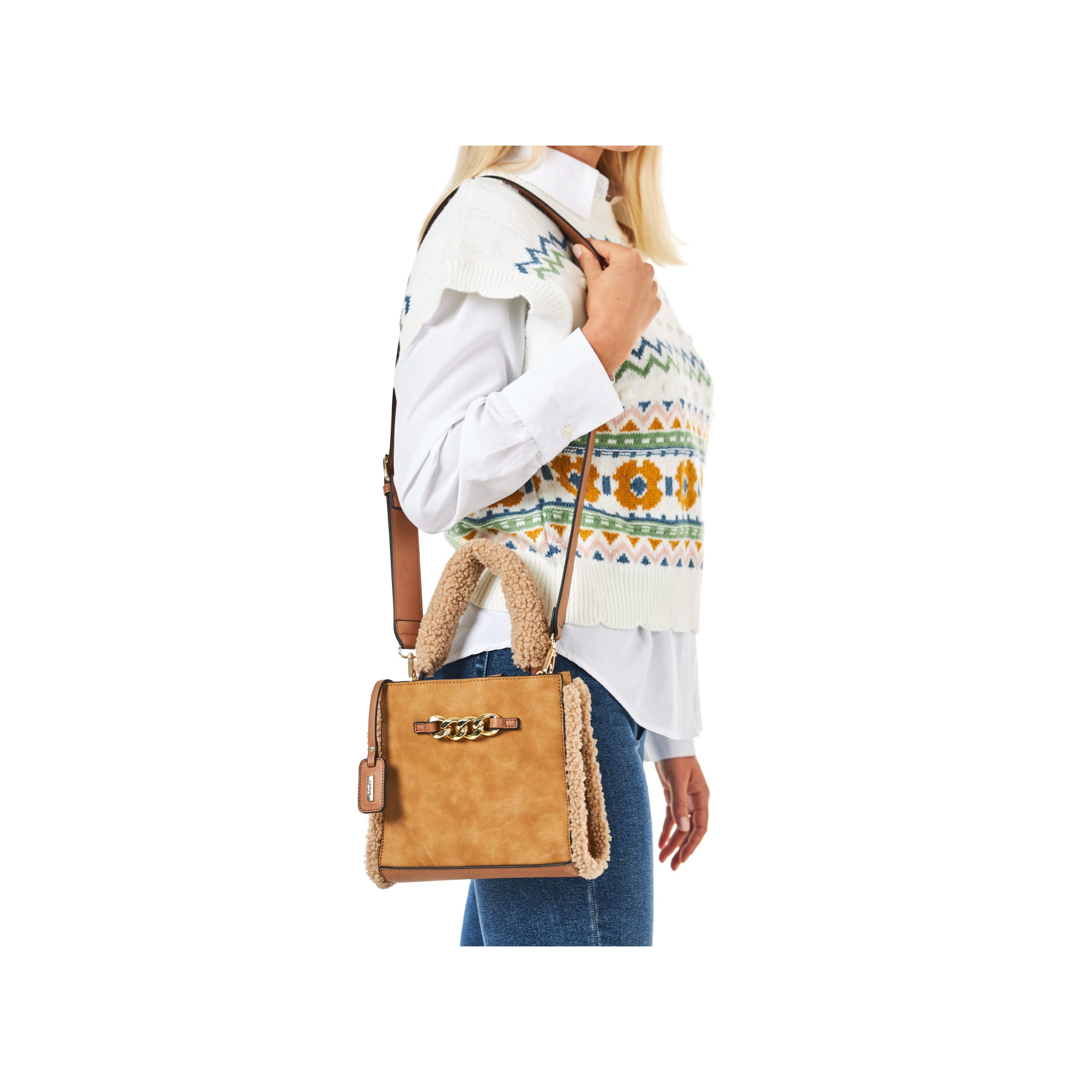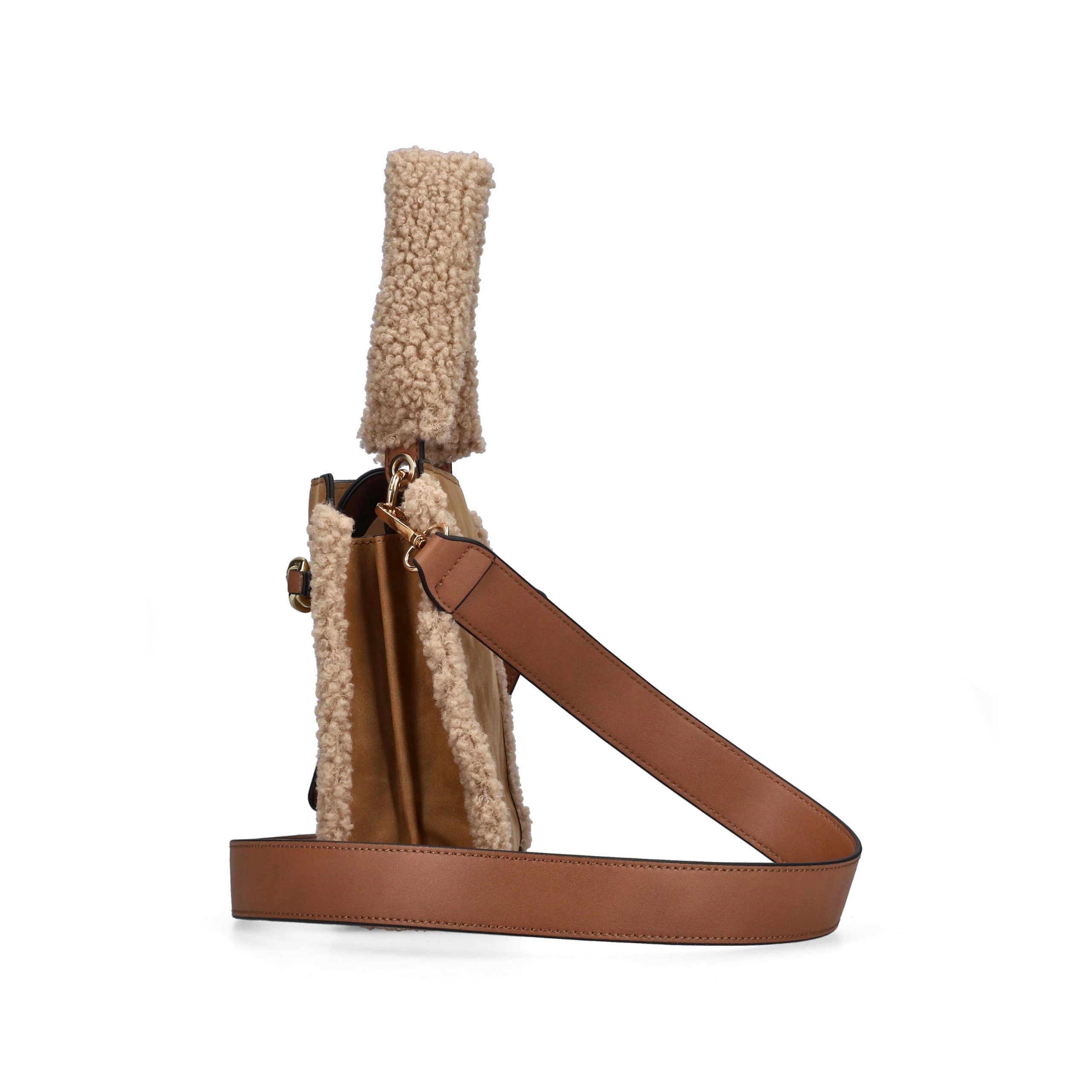 Small, but not to be underestimated! This brown-beige bag is a fashionable eye-catcher with its teddy highlights and golden details. Its main pocket is divided into two equal parts, one with an inner zip pocket and the other with two small pockets without closure. The main pockets are practically closed by a strap with